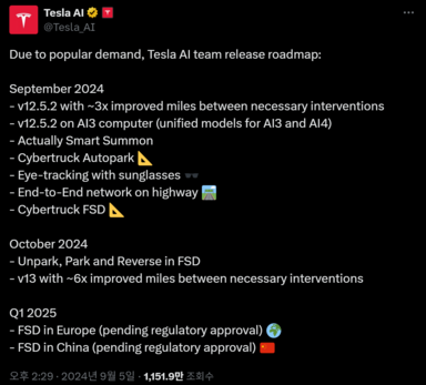 일론 머스크, 다음주 부터 Grok AI를 테슬라 차량에 통합하겠다고 발표