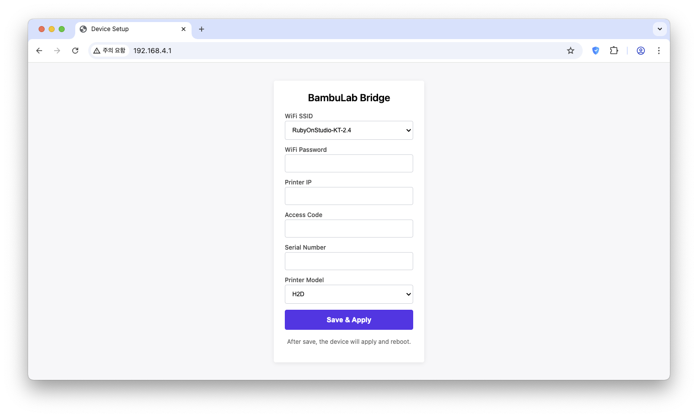 5. 파란색 LED 가 깜빡이는 상태에서 아이폰이나 컴퓨터로 BambuLab Homekit Connector AP 에 접속을 합니다 (비번: password)