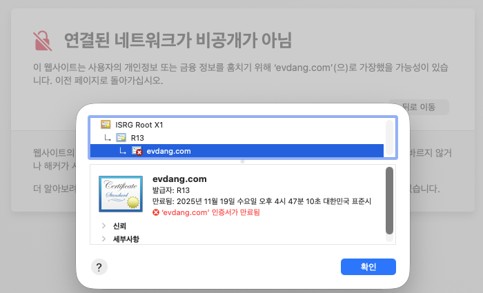 사이트가 1시간 전에 도메인 인증서 만료로 접속되지 않았습니다.