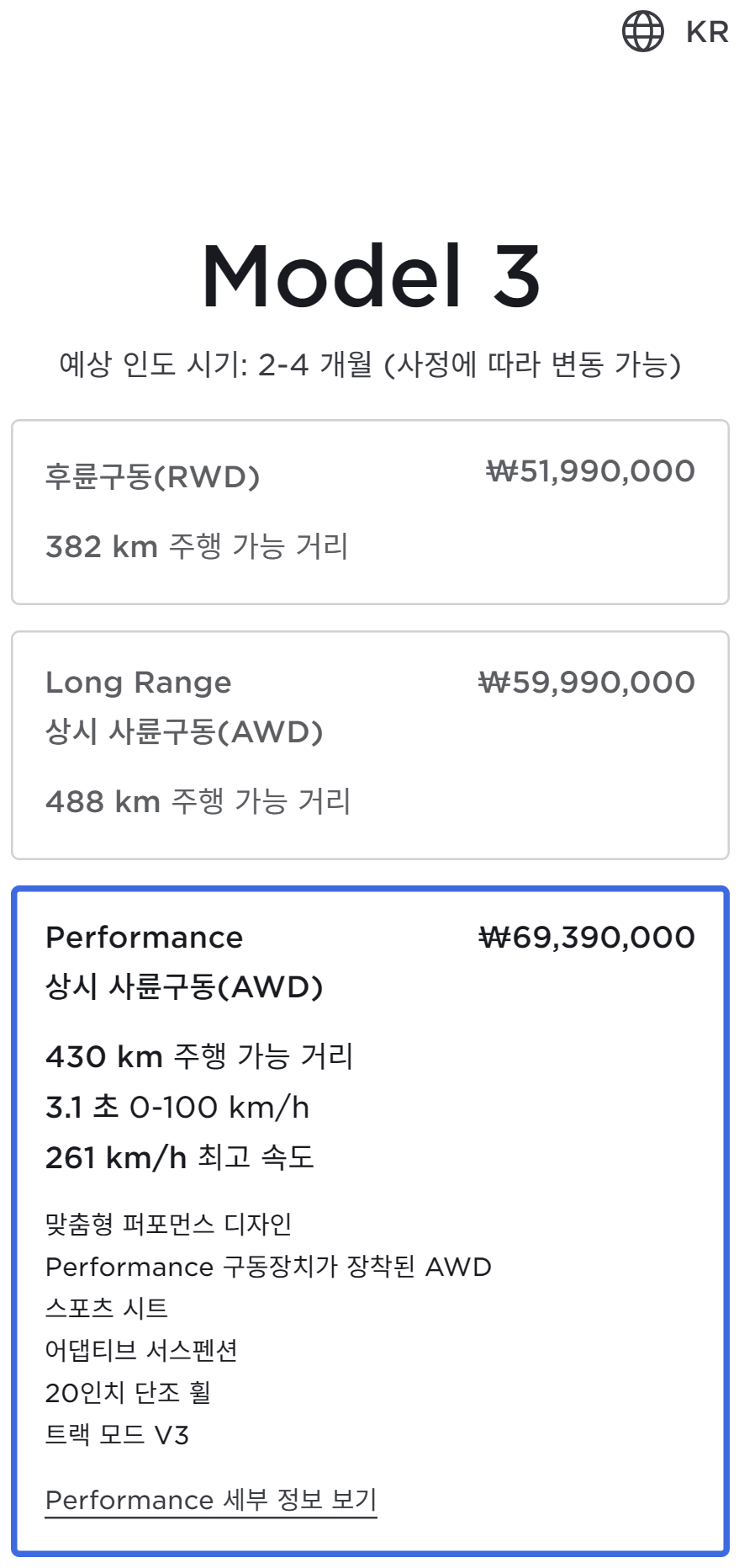 모델 3 퍼포먼스 모델의 국내 판매 가격이 6,799만원에서 6,939만원으로 140만원 인상되었습니다.