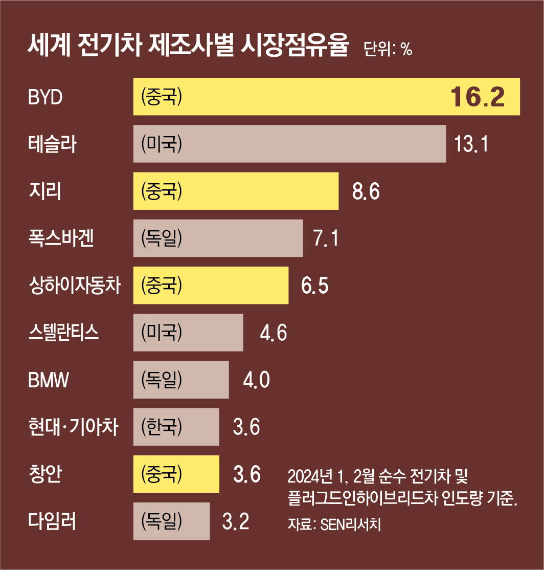 일론 머스크 테슬라 최고경영자(CEO)는 1월 실적 발표에서 “(중국과) 무역장벽을 세우지 않으면 전 세계 대부분의 다른 자동차 회사들을 거의 무너뜨릴 것(demolish)”이라고 말했고, 글로벌 자동차 제조업체 스텔란티스의 카를루스 타바르스 CEO도 중국 저가 전기차를 따라잡지 못하는 기업은 “존폐의 기로에 서게 될 것”이라고 밝혔다.